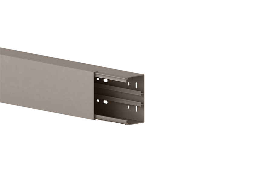 - Installation trunking made of PVC according to DIN EN 50085-2-1 for cable routing on walls and ceilings, consisting of a completely overlapping cover and base with double-row base perforation for fastening and a DIN rail for the installation of device installation boxes as well as partition walls, 4 cable retaining clips are included per 2 metre. Note: Sound and fire protection measures must be carried out professionally