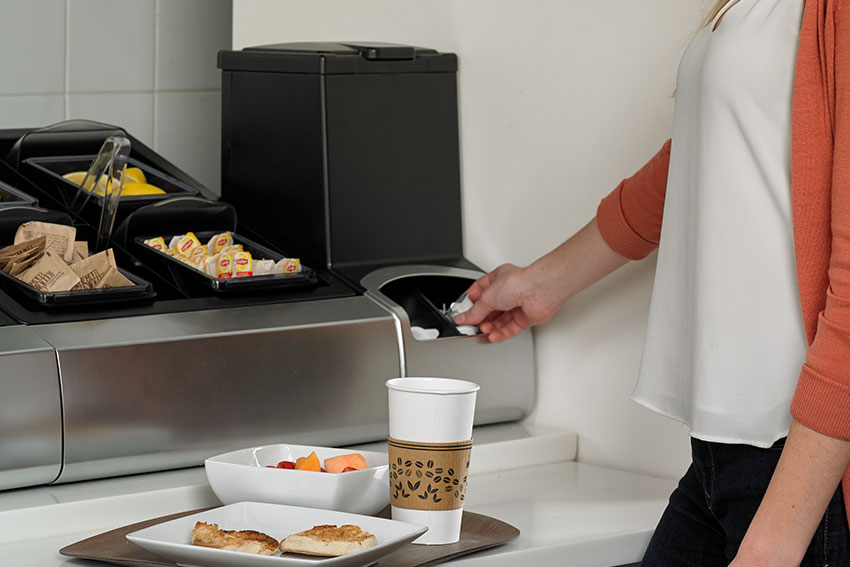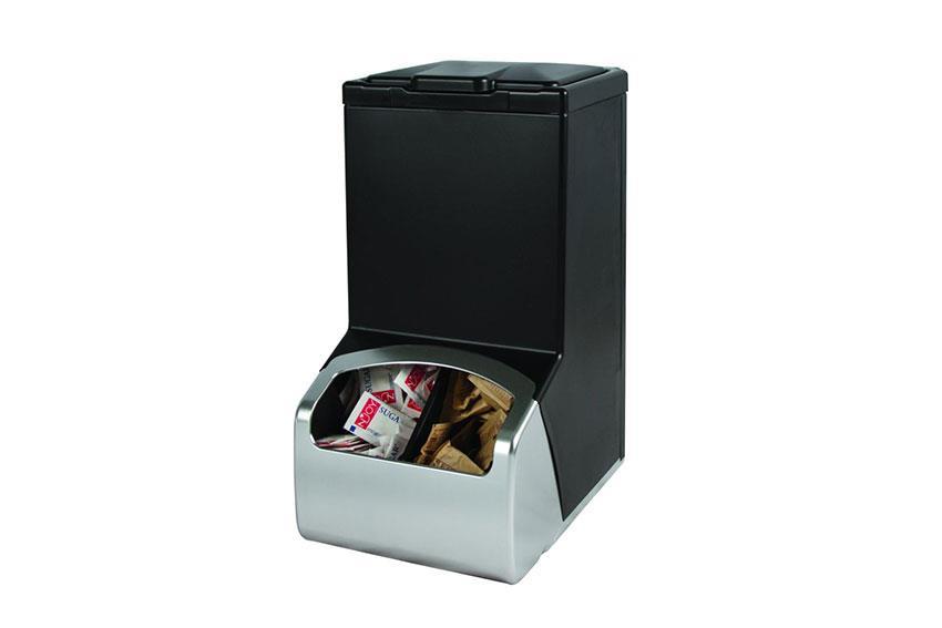 - Brede opening voor First-In, First-Out verdeling van koffietoebehorenzoals suiker, room, rietjes, roerstaafjes, ...
